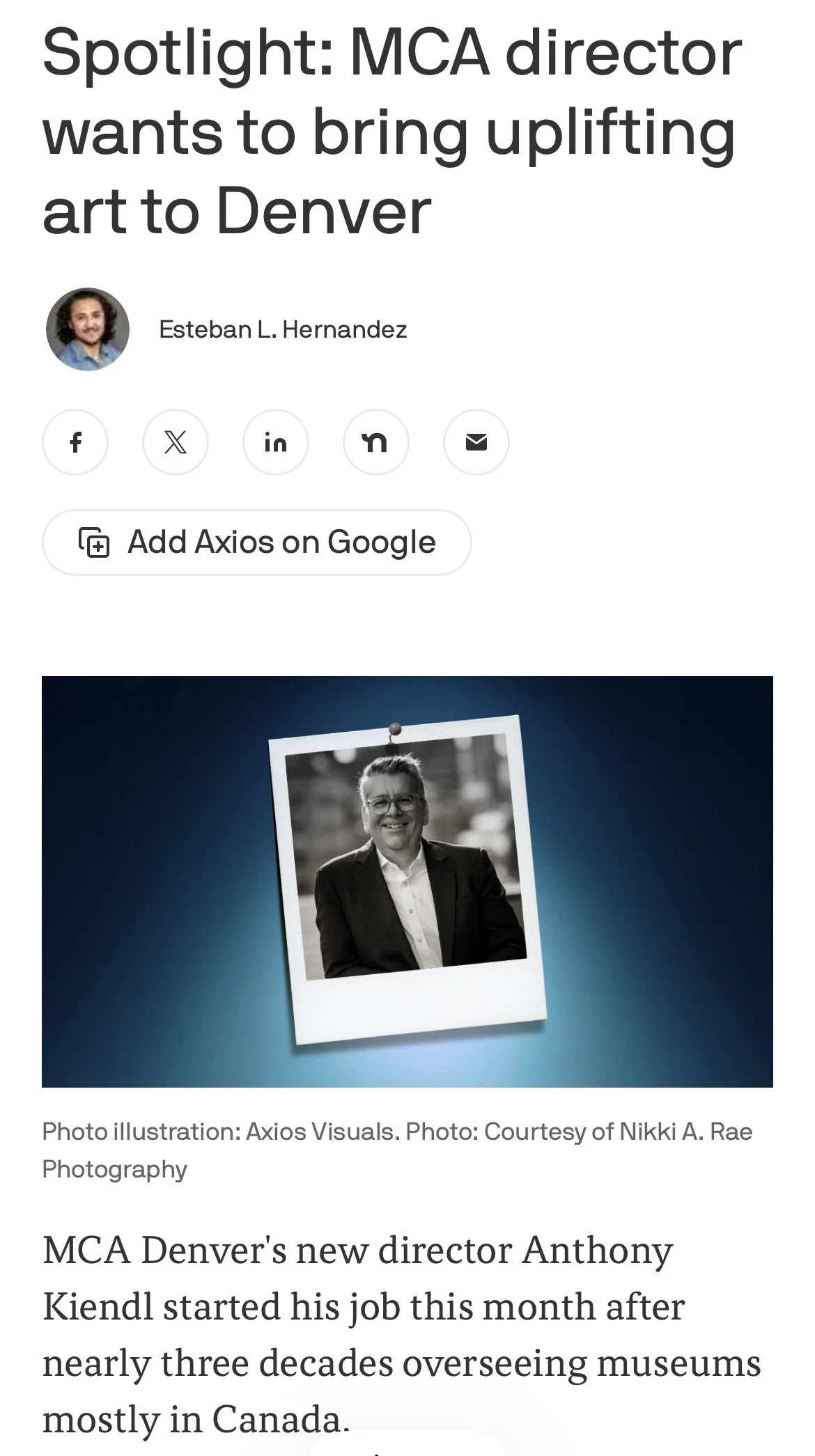 Anthony Kiendl was appointed as the Mark G. Falcone Director of MCA Denver effective December 1, 2025.